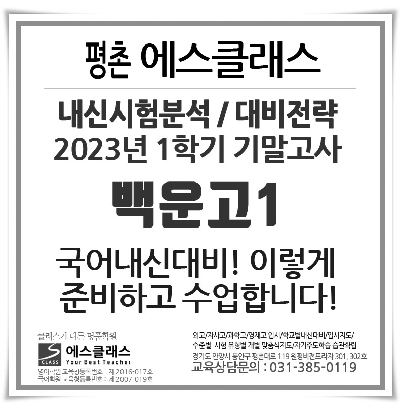 평촌학원가 대표 국어전문학원 평촌에스클래스학원이 알려주는 백운고 국어시험 출제경향과 고득점 비법! 평촌에스클래스학원은 명문대 출신 선생님들이 소수그룹으로 꼼꼼하게 강의하고 관리해주는 학원입니다! 백운고 국어시험 관리는 평촌에스클래스학원에서 받으세요~
